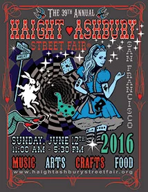 Since the event began, every Haight-Ashbury Street Fair has its own poster image that "reflects the many facets that make this event memorable and one of the most anticipated events in San Francisco." A contest is held annually, with poster submissions coming from anyone who wishes to contribute.  Many of these original works of art have become highly sought after collector Items.  This year's winner of the 39th Haight Ashbury Street Fair poster contest is Lily Prillinger, whose work is shown below.