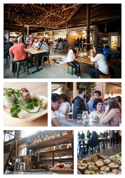 The Hall is a food and drink venue in the Mid Market neighborhood of San Francisco. It opened its doors in 2014 in what was once a billiards hall and has grown in popularity thanks to its half dozen independent local food vendors, open and centralized seating and great bar scene with a lively happy hour that serves small production California beer and wine.