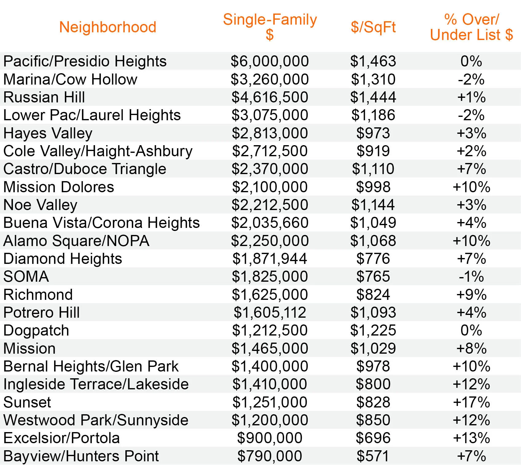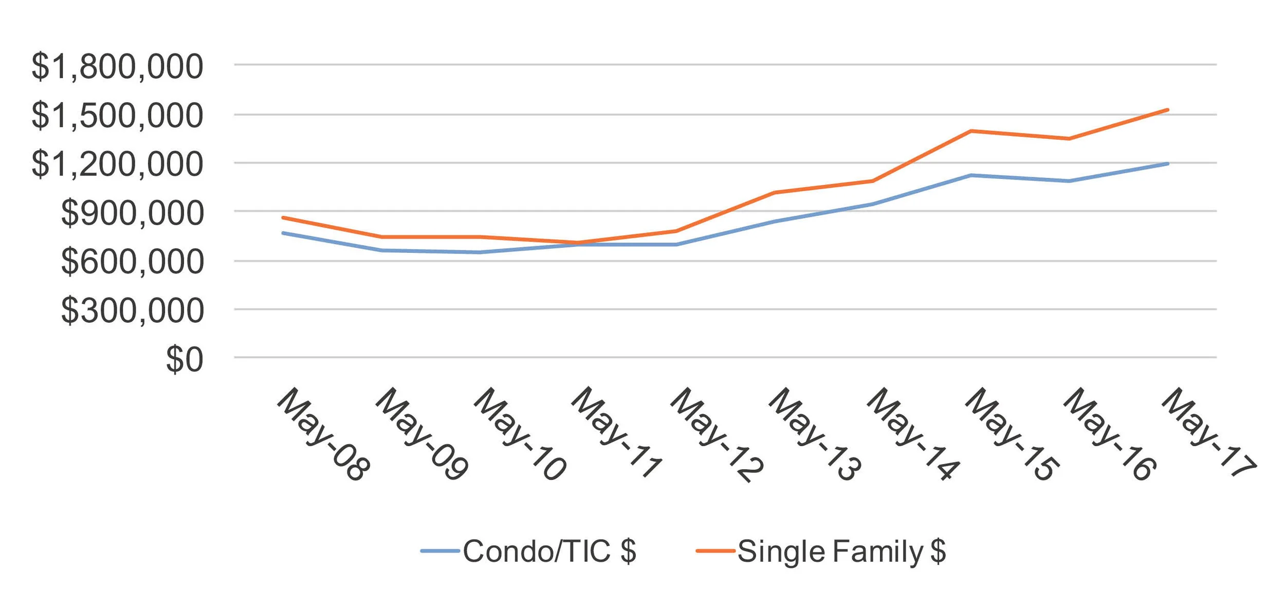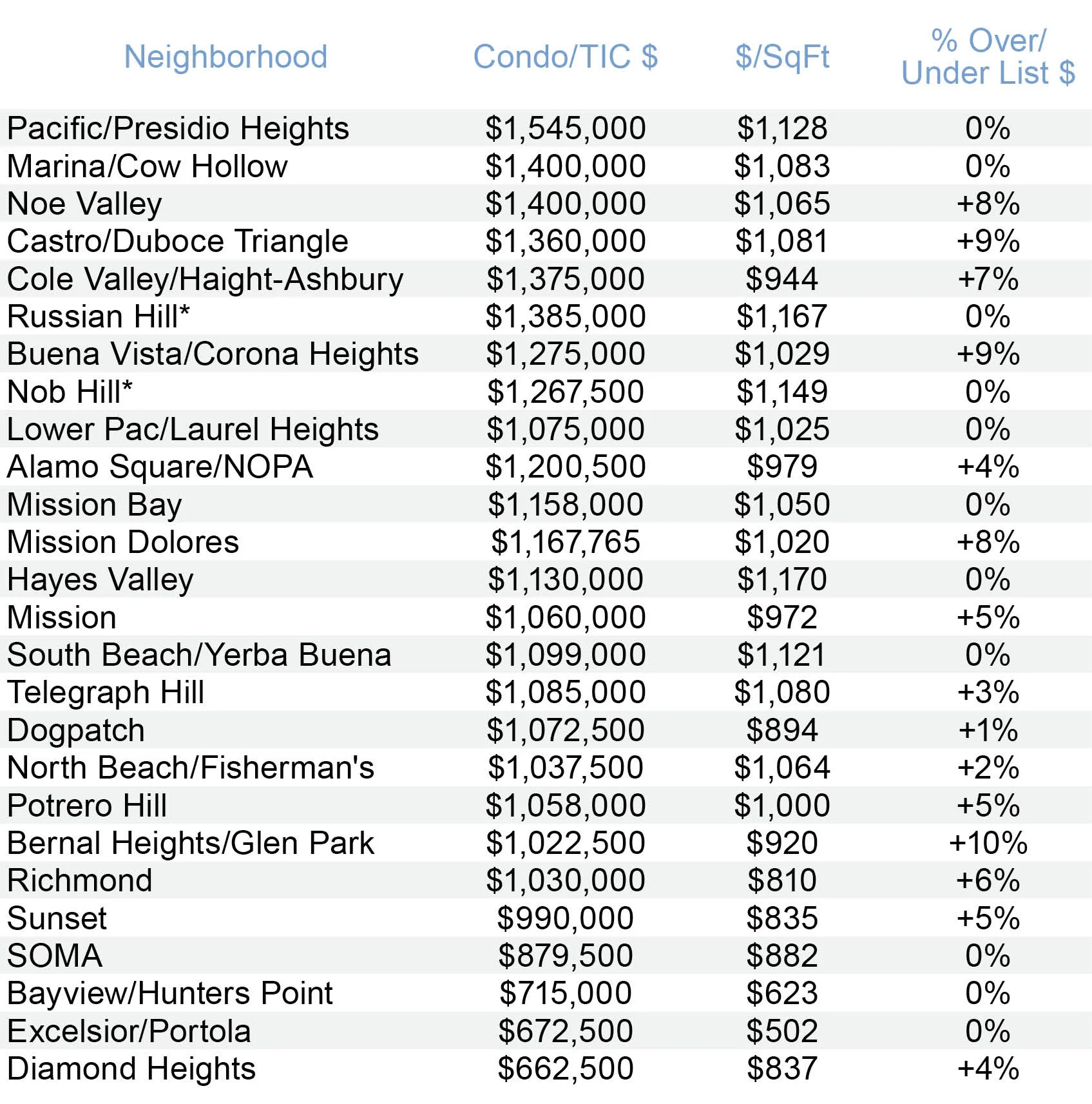 Last month represented the strongest year-over-year gains in median values this year, with both condominium/TIC and single family seeing double digit percentage increases. Single family values continued to be the shining star, with purchasers paying an average of 16% over list price, versus 6% for condominium/TIC. The single family median home price for the City has now passed the $1.5MM mark. Sunset and Parkside continued to see the greatest pressure, with purchasers paying an average of 25% over list price. Another market segment which saw exceptional performance was the middle price tier of $1.2MM to $1.8MM, with purchasers paying an average of 22% over list price. Single family homes over $3MM have also performed well as of late, with a 31% increase in the number of transactions year-to-date, as compared to last year. However, there is currently a three month supply of homes in this price tier, as compared to one month in the overall market. Condominium/TIC performance is also on the upswing, with a ten percent year-over-year gain, and having reached a notable median sale price of $1.2MM.